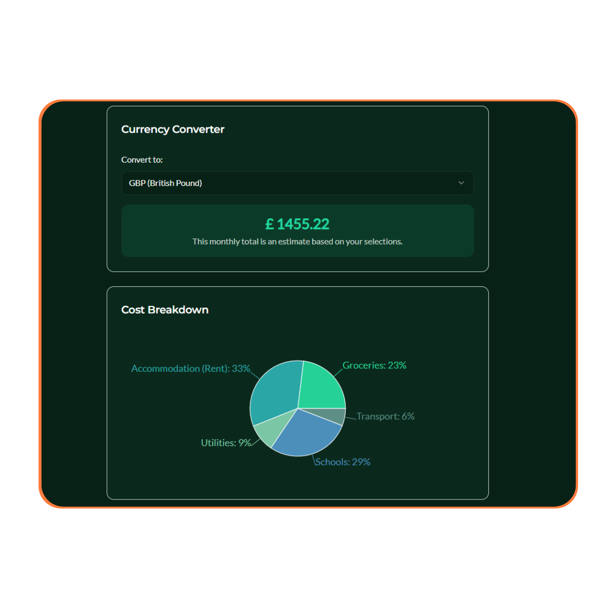 No vague estimates. Use the interactive cost of living calculator to plug in your lifestyle, kids’ schooling, and housing choices to get a ballpark figure before you spend a single penny.