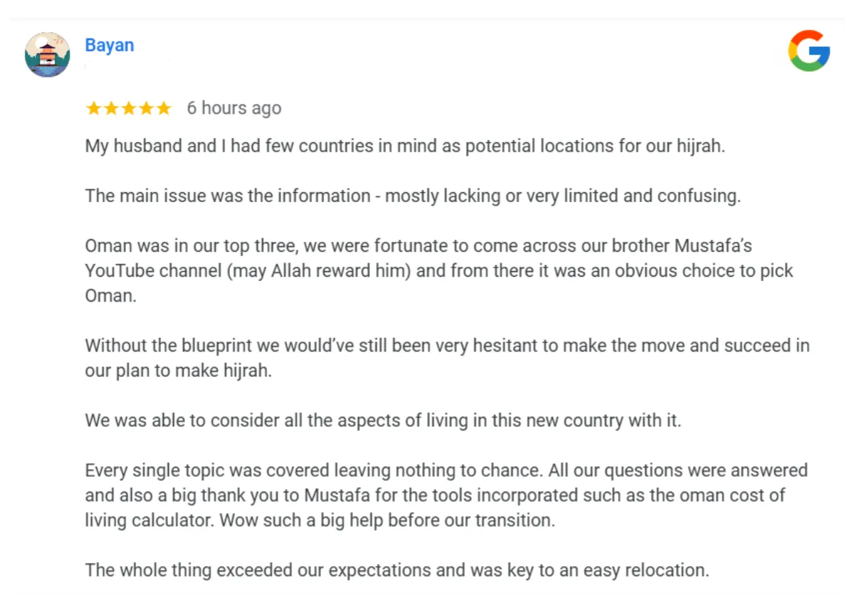 I’d been following Mustafa on YouTube for a while and fell in love with the idea of moving to Oman. The plan was to make the move by the end of the year. Alhamdulillah I decided to go through the Blueprint first. There were things in there Mustafa covered that turned out to be complete deal breakers for me. It literally saved me a whole country shift. This one resource saved me from making the wrong move that I was completely set on. I've got a few other countries on the radar now. Thank you brother.